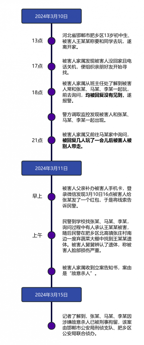 近日,河北邯鄲三初中生殺害同學案件引起廣泛關注。群情激憤之下,眾多網友評論:“建議死刑。”究竟是怎樣惡劣的案件會讓網友如此評論?筆者根據新聞報道整理時間軸如下: