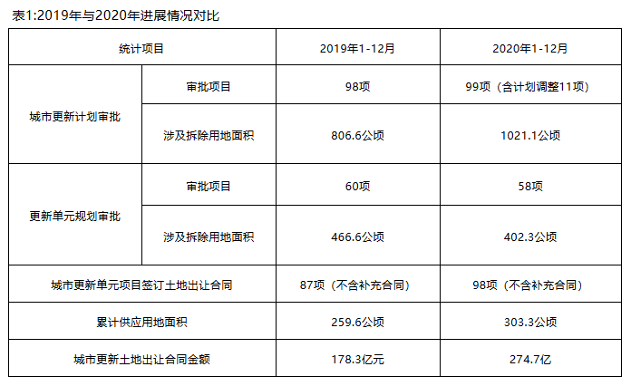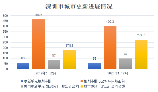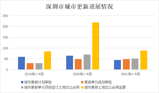 深圳市城市更新和土地整備局公布了2019年、2020年、2021年1-9月的深圳城市更新進展情況,從2019年度、2020年度的城市更新活動情況對比圖來看,我們可以發現城市更新項目的計劃審批、涉及拆除用地面積、城市更新單元項目簽訂土地出讓合同數量、累計供應用地面積、城市更新土地出讓合同金額均呈現明顯的增長趨勢。