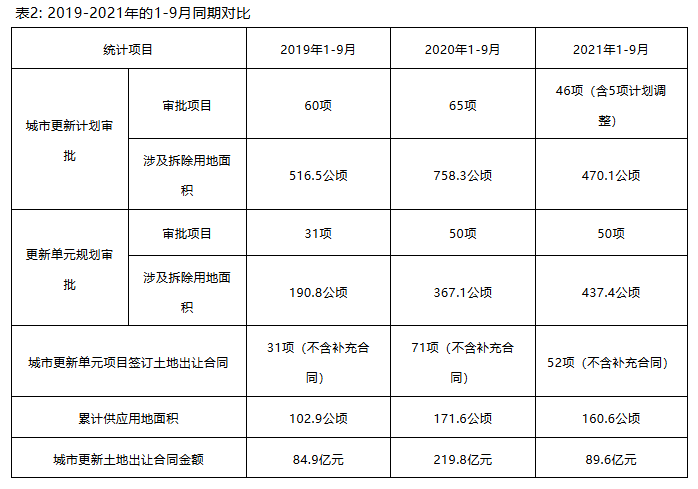 從2019-2021年三年的1-9月同期對比來看,城市更新單元規劃審批涉及拆除面積數據顯著增加,規劃審批項目數量呈增加趨勢,綜合來看2020年在計劃更新審批涉及拆除面積、城市更新單元項目簽訂土地出讓合同數量、合同金額、累計供應用地面積等方面,均為三年同期中的最高值,顯然2020年也是深圳城市更新項目活動較為活躍、開展力度較大的一年。但2021年1-9月的城市更新計劃審批項目僅46項,相比2020年1-9月減少了19項,同比下降了近30%;涉及拆除用地面積為470.1公頃,相比2020年1-9月減少了288.2公頃,同比下降了約38%。
