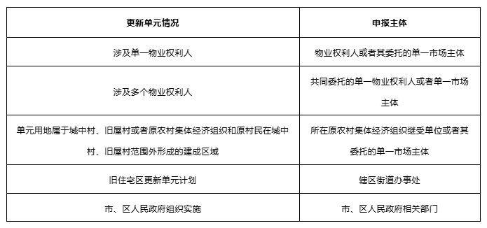 具體而言,城市更新單元計劃的申報需結合更新單元實際情況來確定申報主體: