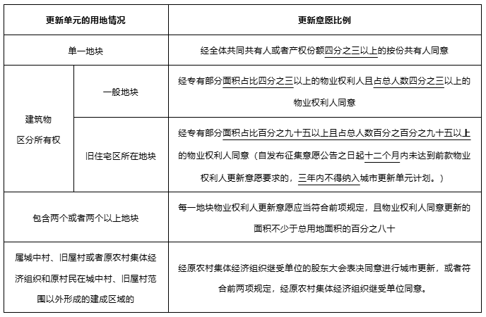 除前述的申報主體需符合對應要求外,申報單元計劃前,申報主體需組織開展更新改造現狀調研、城市更新單元擬訂、意愿征集、可行性分析等工作。其中,城市更新單元內的權利主體具備城市更新意愿必須符合法定比例要求: