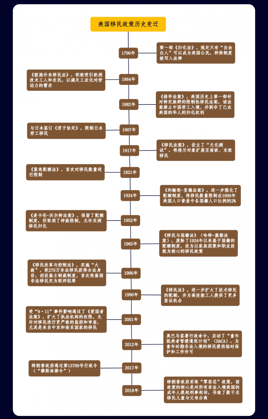 美國作為一個移民國家,其移民政策的歷史變遷深刻反映了國家發展、社會矛盾和國際形勢的變化。從建國初期的開放政策到19世紀末的種族歧視,再到20世紀中期的系統性改革,美國的移民政策始終在開放與限制之間搖擺。總體而言,美國移民政策從立國之后有開放包容時期、有種族針對時期,有嚴格限制時期,進入20世紀之后則是在有限開放中帶有歧視。目前美國移民政策帶有制造業回歸,吸引工程師、創業者等高端人才的政策導向,對政策內的全球申請人而言屬于較友好時期。