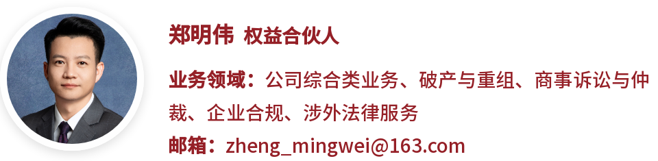 鄭明偉,深圳大學(xué)國(guó)際法碩士,北京中銀(深圳)律師事務(wù)所公司綜合業(yè)務(wù)委員會(huì)主任、權(quán)益合伙人,北京對(duì)外經(jīng)濟(jì)貿(mào)易大學(xué)校外導(dǎo)師,《法制日?qǐng)?bào)》律師專(zhuān)家;
