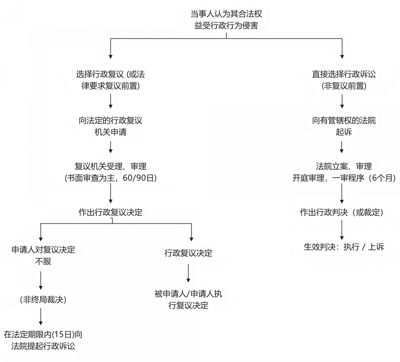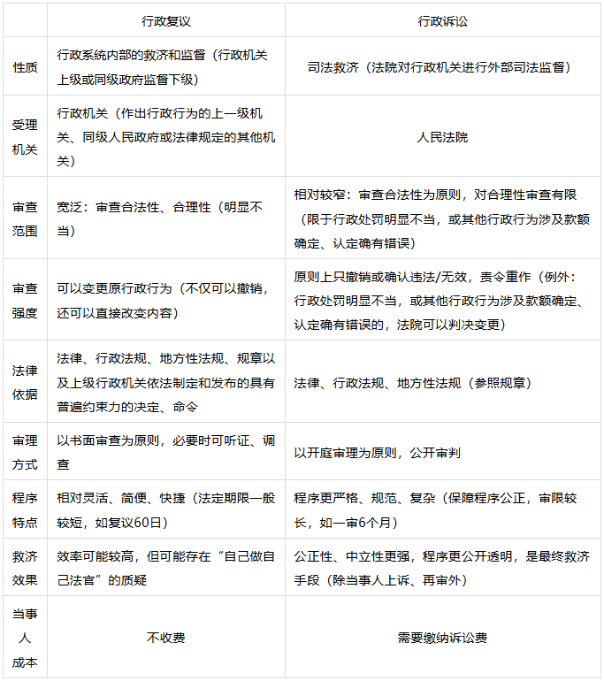 如果對行政行為的合法性有強烈質疑,或追求更強程序保障,希望法院裁決,或者對復議結果預期不樂觀,可以直接或復議后選擇行政訴訟。行政訴訟的程序保障和司法終局性更受信賴。