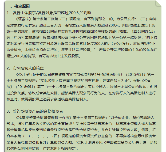 1、三類股東問題三類股東是指以契約型私募基金、資產管理計劃、信托計劃的形式直接或間接持有企業股份的股東。三類股東問題主要是企業在新三板做市交易時形成的。由于三類股東本身并不是法律主體,僅為投資工具,這類投資工具的投資人并不顯示于工商登記資料中,投資人的信息保密,因此會產生股權結構不清晰、信息披露不完全的問題,會造成股份代持、利益輸送,關聯交易等問題,進而不符合《首次公開發行股票并上市管理辦法》第十三條所要求的“股權清晰穩定”、第二十五條要求的不存在利益輸送,因此“三類股東”是證監會審核的重點。在IPO反饋階段,除了核查股東人數是否超過200人之外,還需要進一步對三類股東進行詳細的核查與披露。