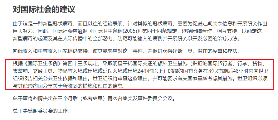 “對國際社會的建議”包括“根據(jù)《國際衛(wèi)生條例》第四十三條規(guī)定,采取明顯干擾國際交通的額外衛(wèi)生措施(指拒絕國際旅行者、行李、貨物、集裝箱、交通工具、物品等入境或出境或延誤入境或出境24小時以上)的締約國有義務(wù)在采取措施后48小時內(nèi)向世界衛(wèi)生組織報告相關(guān)公共衛(wèi)生依據(jù)和理由。世界衛(wèi)生組織將審查這些理由,并可能要求有關(guān)國家重新考慮其措施。世界衛(wèi)生組織必須與其他締約國分享關(guān)于所收到的措施和理由的信息?!?