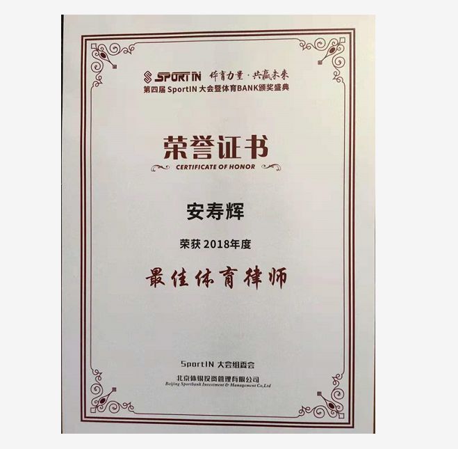 安壽輝律師團隊在文化體育領域具有豐富的經驗,擔任多家文化體育公司的法律顧問,曾被體育BANK評為“2018年最佳體育律師”。