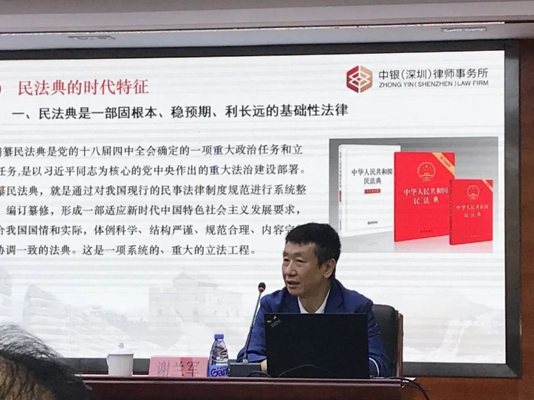 11月24日上午,廣東省律師協會法律職業共同體委員會委員、深圳市人大代表、北京市中銀(深圳)律師事務所黨支部書記、高級合伙人謝蘭軍律師受邀前往燕羅街道辦開展《民法典》專題講座。燕羅街道辦領導、轄區各社區負責人及街道辦科級以上干部參加講座。