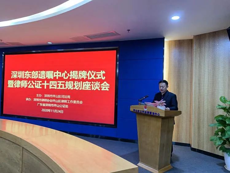 2020年11月24日下午,由坪山區司法局主辦、坪山區律工委、坪山公證處承辦的深圳東部遺囑中心揭牌儀式暨律師公證十四五規劃座談會在創新廣場A座20樓順利舉行,中銀律所婚姻家事及財富傳承專業委員會主任貢小娟律師、委員趙紅軍律師受邀出席會議。