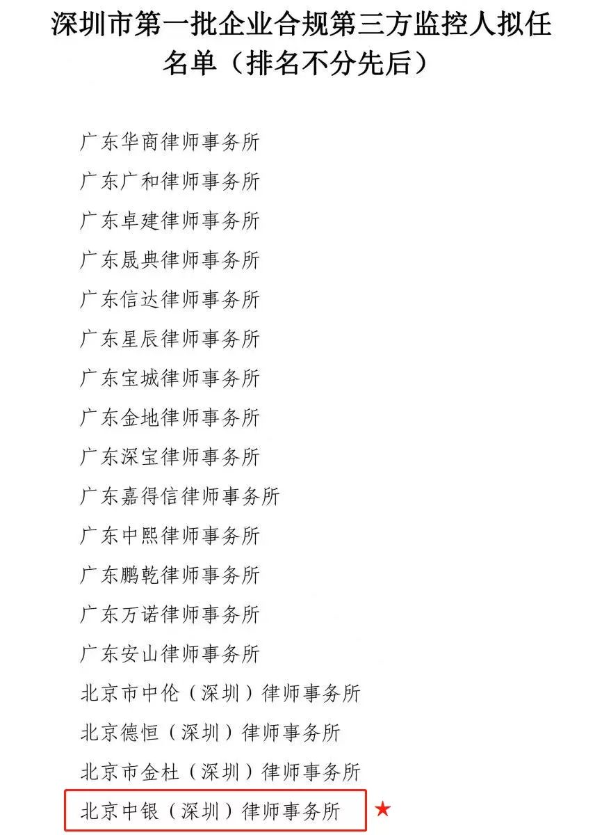 深圳市司法局于2021年9月24日發(fā)出公告,面向社會(huì)公開選任企業(yè)合規(guī)第三方監(jiān)控人。經(jīng)機(jī)構(gòu)申報(bào)、主管部門推薦,并經(jīng)深圳市企業(yè)合規(guī)第三方監(jiān)督評估機(jī)制管理委員會(huì)第二次全體成員會(huì)議審議,北京中銀(深圳)律師事務(wù)所十分榮幸成為深圳市第一批企業(yè)合規(guī)第三方監(jiān)控人。