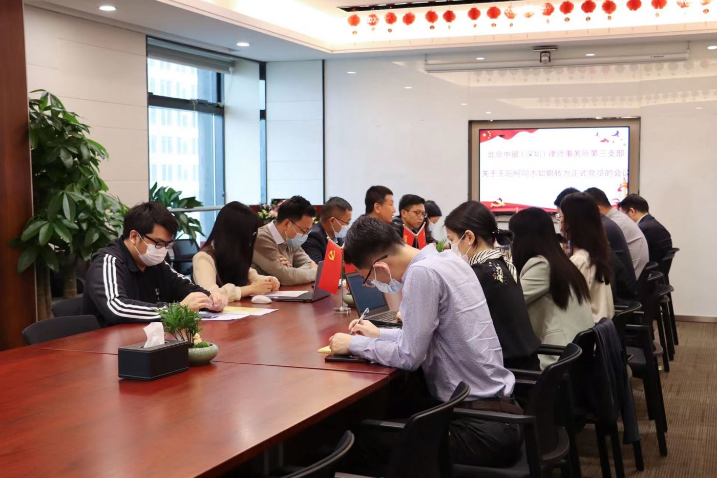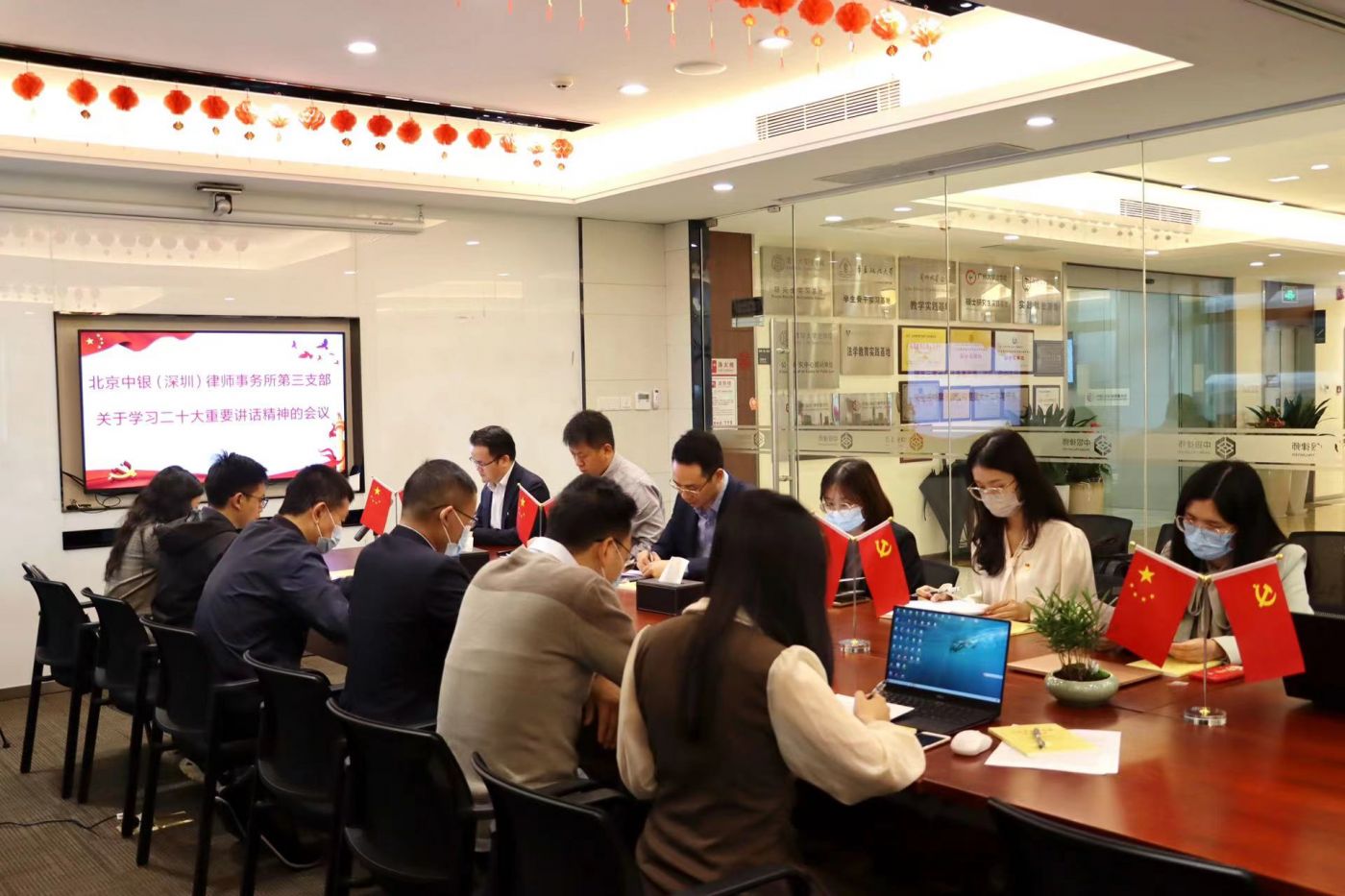 11月2日上午,北京中銀(深圳)律師事務所黨總支謝蘭軍書記、李良機副書記、潘良組織委員在第三黨支部召開黨員大會之際,通過線上線下結合方式,同時組織全所黨員同志(因疫情限制,第一、第二黨支部黨員同志通過騰訊會議線上參會)學習二十大報告重要講話精神。會議由第三黨支部書記廖燁明同志主持。