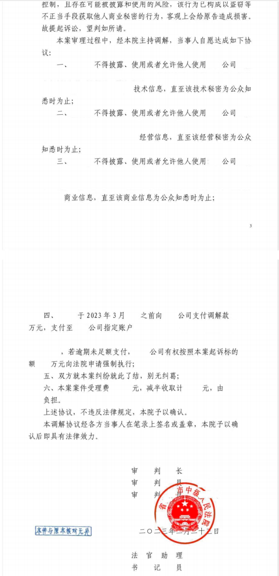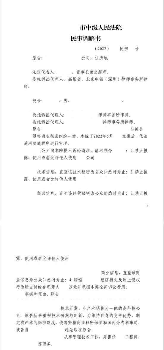 近日,中銀深圳知識產權團隊幫助某上市企業,通過訴訟談判成功處理了一起涉及竊取技術信息、經營信息、商務信息等復雜的信息安全違規事件,前員工不僅不得披露和使用案涉保密信息,直至涉密信息為公眾所知悉,而且還要賠償企業經濟損失及合理維權開支,上述處理結果已由人民法院出具《民事調解書》,且相關款項已經支付完畢,案件取得了良好社會效果。