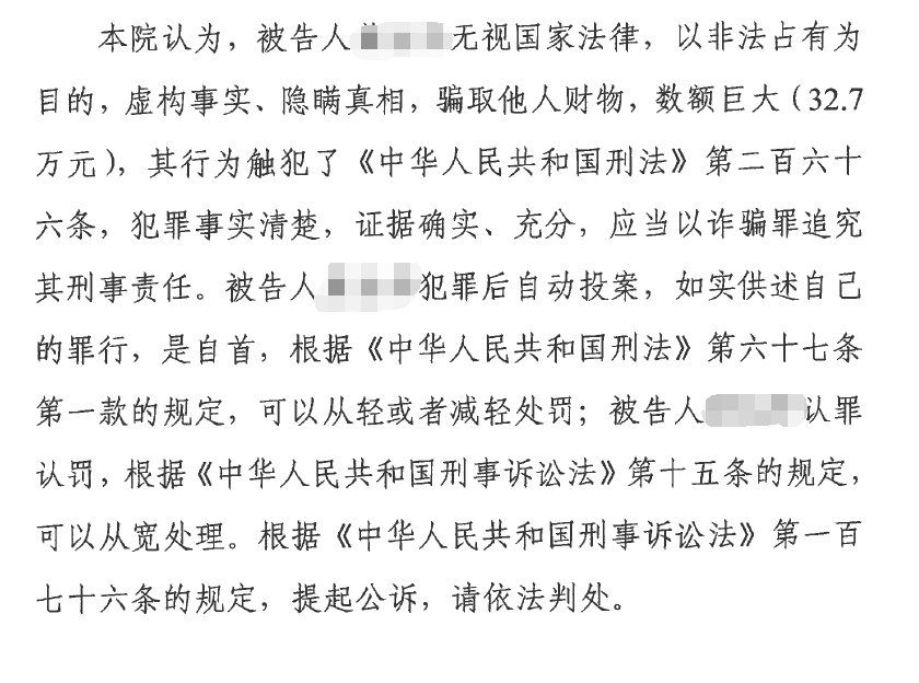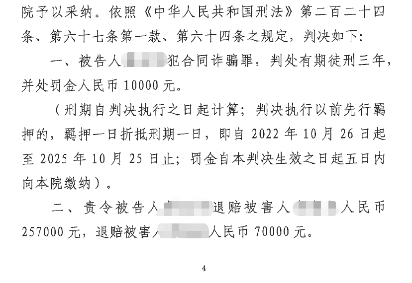 辯護人主張,被告人的“騙”實際是虛構履行能力,本案實際更符合在訂立、履行合同過程中的合同詐騙罪,而非單純完全是以簽訂合同為掩飾外衣的詐騙罪手段。法官、公訴人認可了前述辯護意見,公訴人當庭同意變更罪名為合同詐騙罪,并調整量刑建議為三年。近日,辯護人收取了本案一審判決書:判處被告人犯合同詐騙罪,判處有期徒刑三年,并處罰金1萬元。