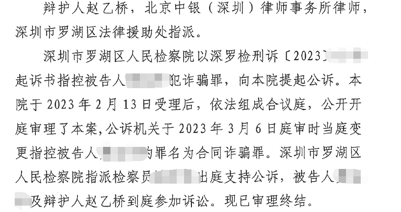 2023年2月下旬,北京中銀(深圳)律師事務所趙乙橋律師,受到深圳市羅湖區法律援助處指派,為某被告人涉嫌詐騙罪一案提供一審法律援助。