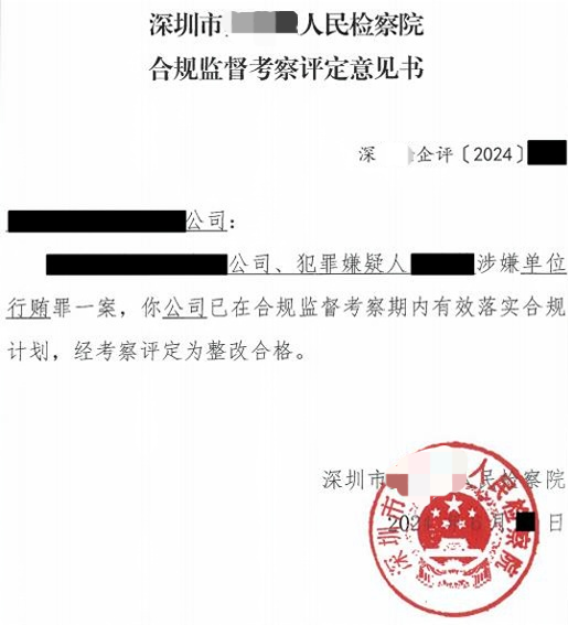 最終××區(qū)檢察院于2024年6月作出《合規(guī)監(jiān)督考察評(píng)定意見(jiàn)書(shū)》,認(rèn)定A公司已在合規(guī)監(jiān)督考察期內(nèi)有效落實(shí)合規(guī)計(jì)劃,經(jīng)考察評(píng)定為整改合格。