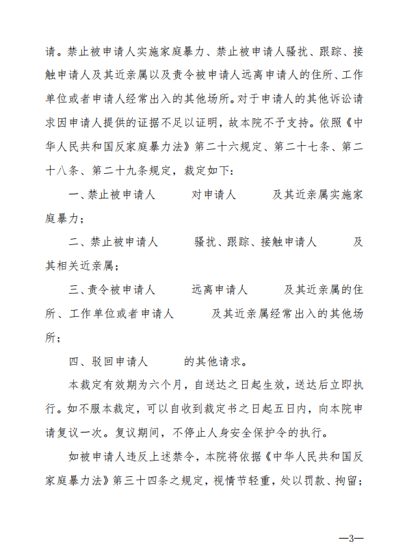 經(jīng)過(guò)代理律師的多次爭(zhēng)取,法院簽發(fā)人身安全保護(hù)令裁定書(shū),并將該裁定向被申請(qǐng)人以及申請(qǐng)人居住地所屬社區(qū)的婦聯(lián)、管轄派出所送達(dá)。