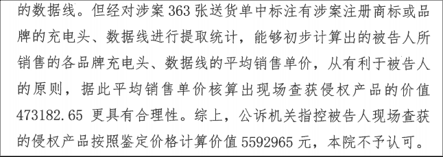 該案中,現場查獲的假冒商品經權利人鑒定價值500多萬余元;該鑒定意見被公訴機關采納,指控被告人C某未銷售部分產品價值500多萬余元。