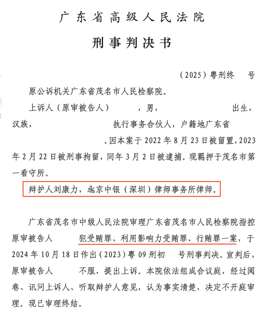 2025年3月,北京中銀(深圳)律師事務所合伙人、刑事法律服務專業委員會主任劉康力律師接受當事人家屬的委托,為涉嫌受賄罪、利用影響力受賄罪、行賄罪的當事人提供案件二審階段刑事辯護法律服務,并為當事人成功爭取不構成行賄罪判決。