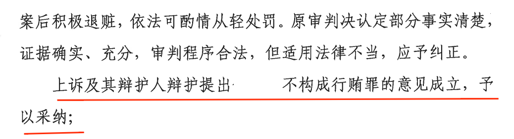 在二審審理期間,劉康力律師及時提交了辯護意見、質證意見及開庭審理申請書等多份書面辯護材料,也多次口頭跟二審承辦法官溝通案件、表達辯護觀點。最終,二審法院通過書面審理作出判決,采納了辯護人的觀點,依法認定本案被告人不構成行賄罪。