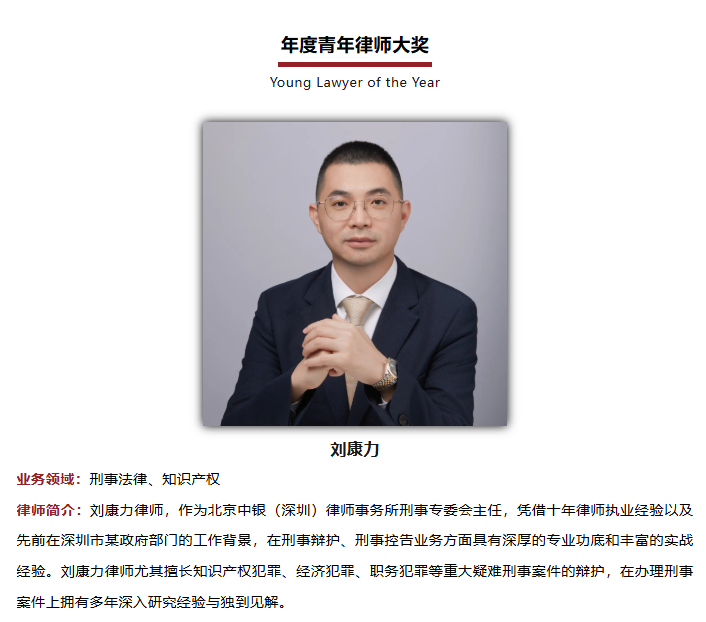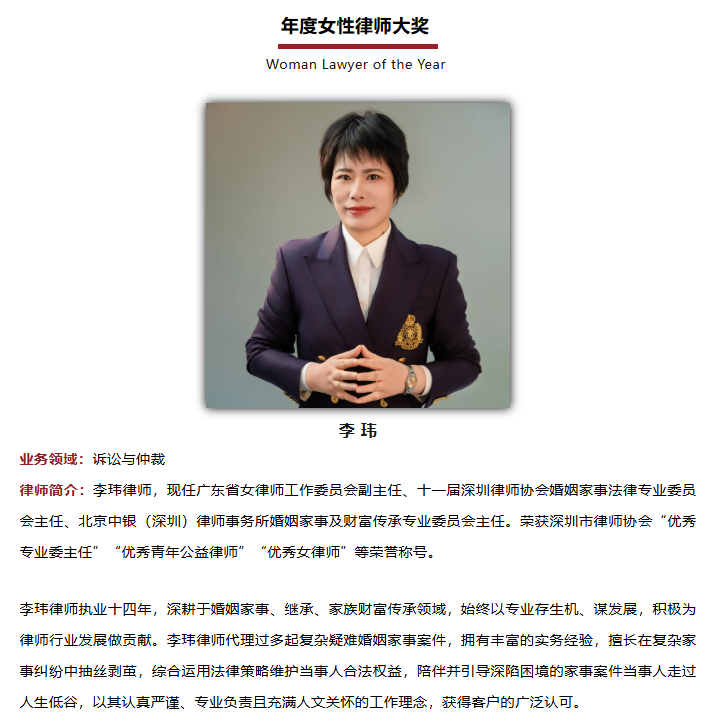 北京中銀(深圳)律師事務所劉康力律師入圍“年度青年律師大獎”(Young Lawyer of the Year);李瑋律師入圍“年度女性律師大獎”(Woman Lawyer of the Year)。