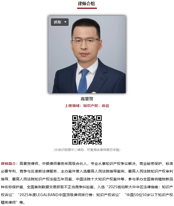 近日,著名法律評級機構LEGALBAND公布了《2025年度中國頂級律師排行榜》榜單。中銀律師事務所高級合伙人高景賀律師憑借出色的專業能力、優質的法律服務和良好的行業口碑入選2025年度中國頂級律師排行榜(“知識產權:訴訟”領域)。