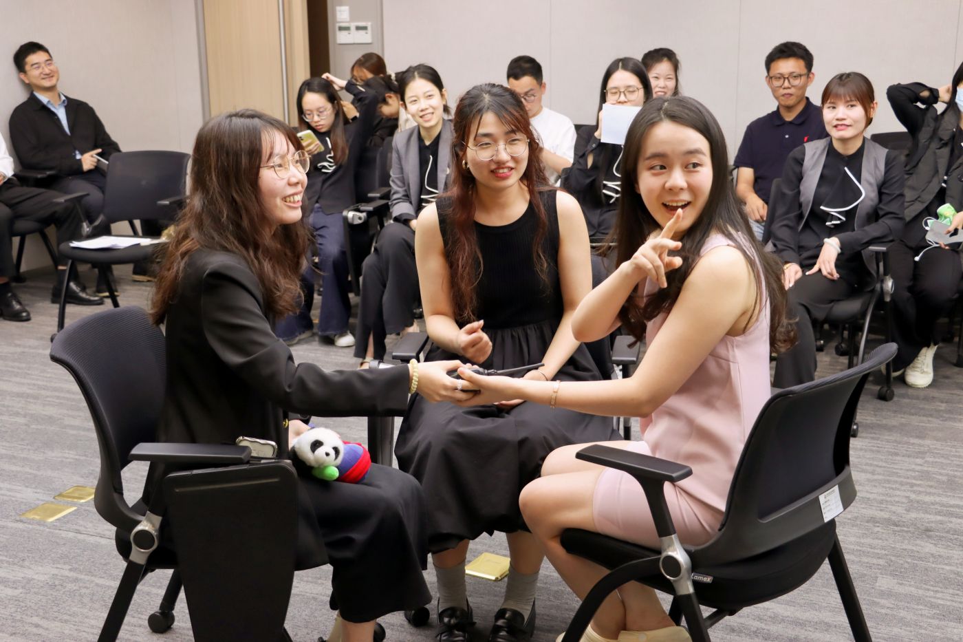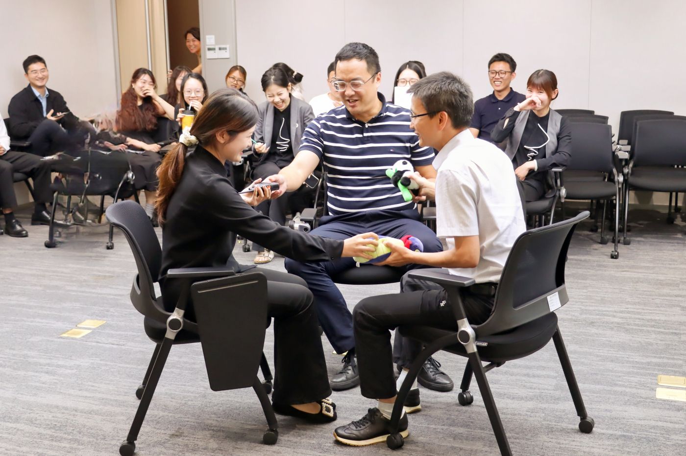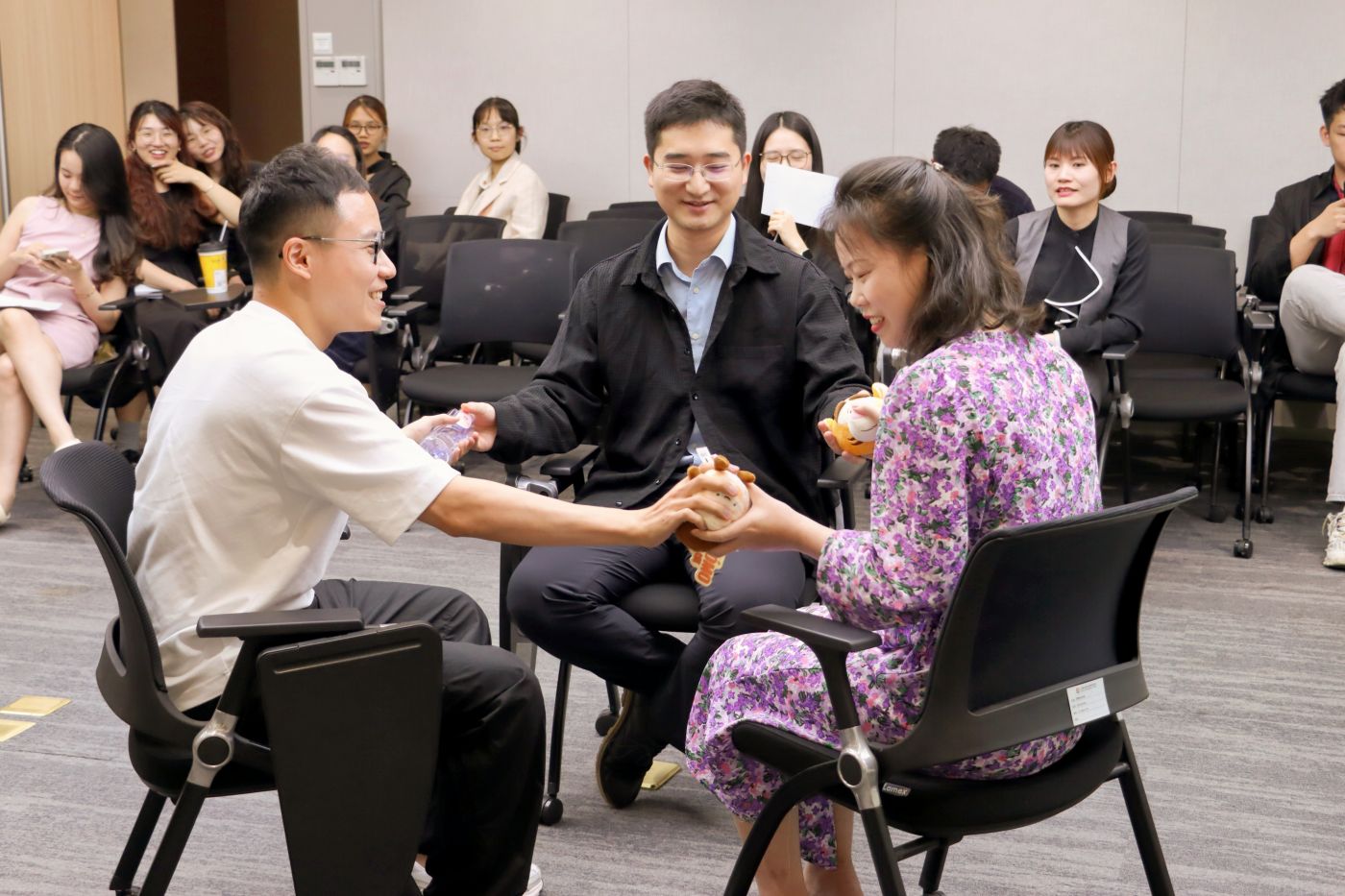 “這是一把勾踐劍”游戲將現場氛圍推向高潮。三人一組默契配合,在歡快節奏中傳遞物品、說對口令。大家全神貫注,不時因口誤或節奏錯亂引得全場哄笑,傳遞三圈成功的小組更是收獲陣陣喝彩,充分展現了團隊協作的樂趣。
