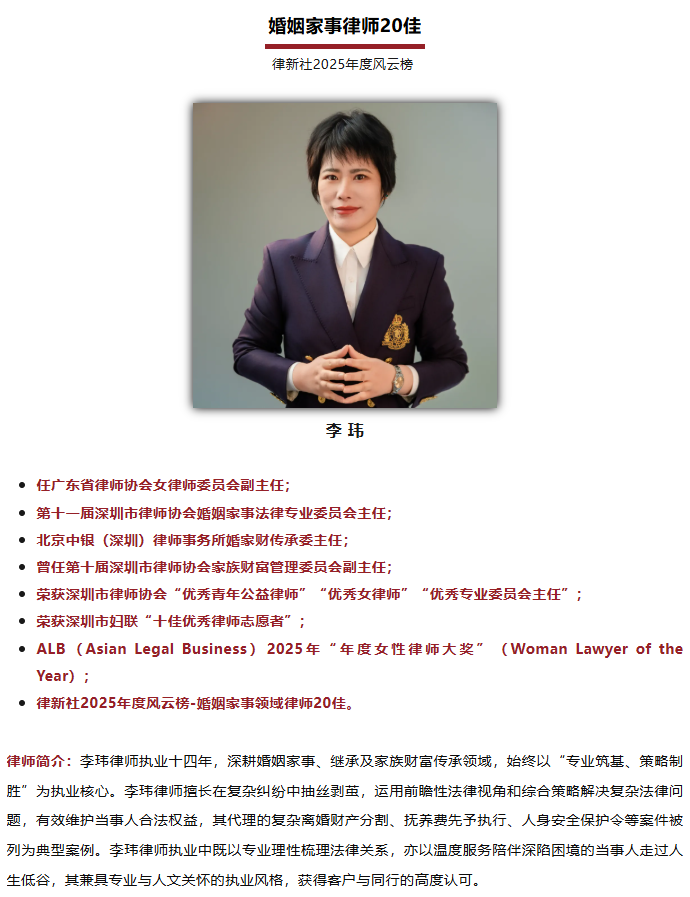 2025年6月19日,律新社公布“律新社2025年度風云榜:婚姻家事律師20佳”榜單,北京中銀(深圳)律師事務所合伙人