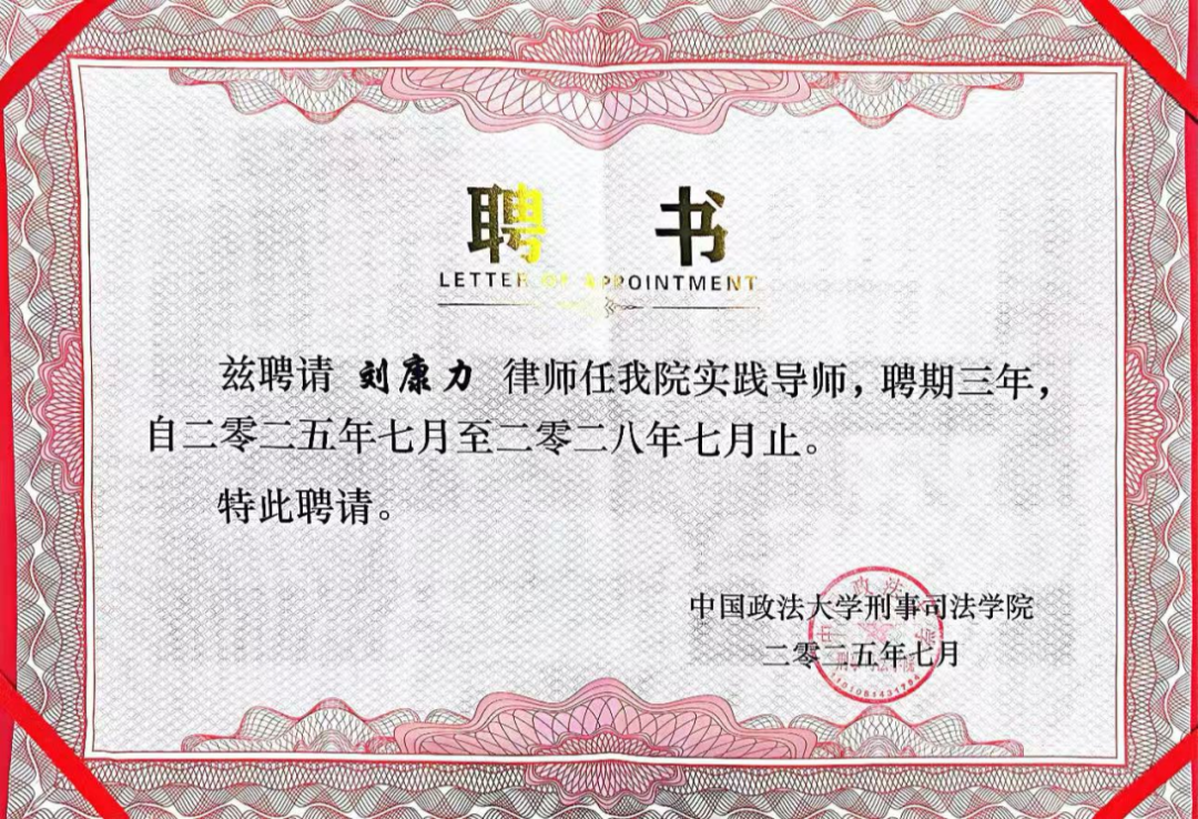 近日,中國政法大學(xué)刑事司法學(xué)院舉行了實踐導(dǎo)師聘任儀式,我所合伙人劉康力律師獲聘實踐導(dǎo)師。