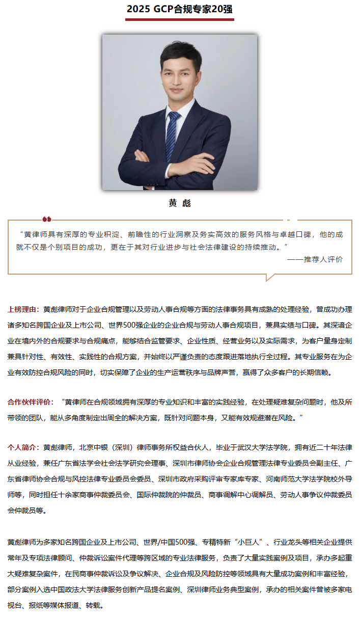 2025年8月7日,GCProfiles發(fā)布“2025 GCP合規(guī)專家20強(qiáng)”榜單,北京中銀(深圳)律師事務(wù)所黃彪律師憑借卓越的客戶/同行口碑及市場(chǎng)表現(xiàn)榮登該榜單。