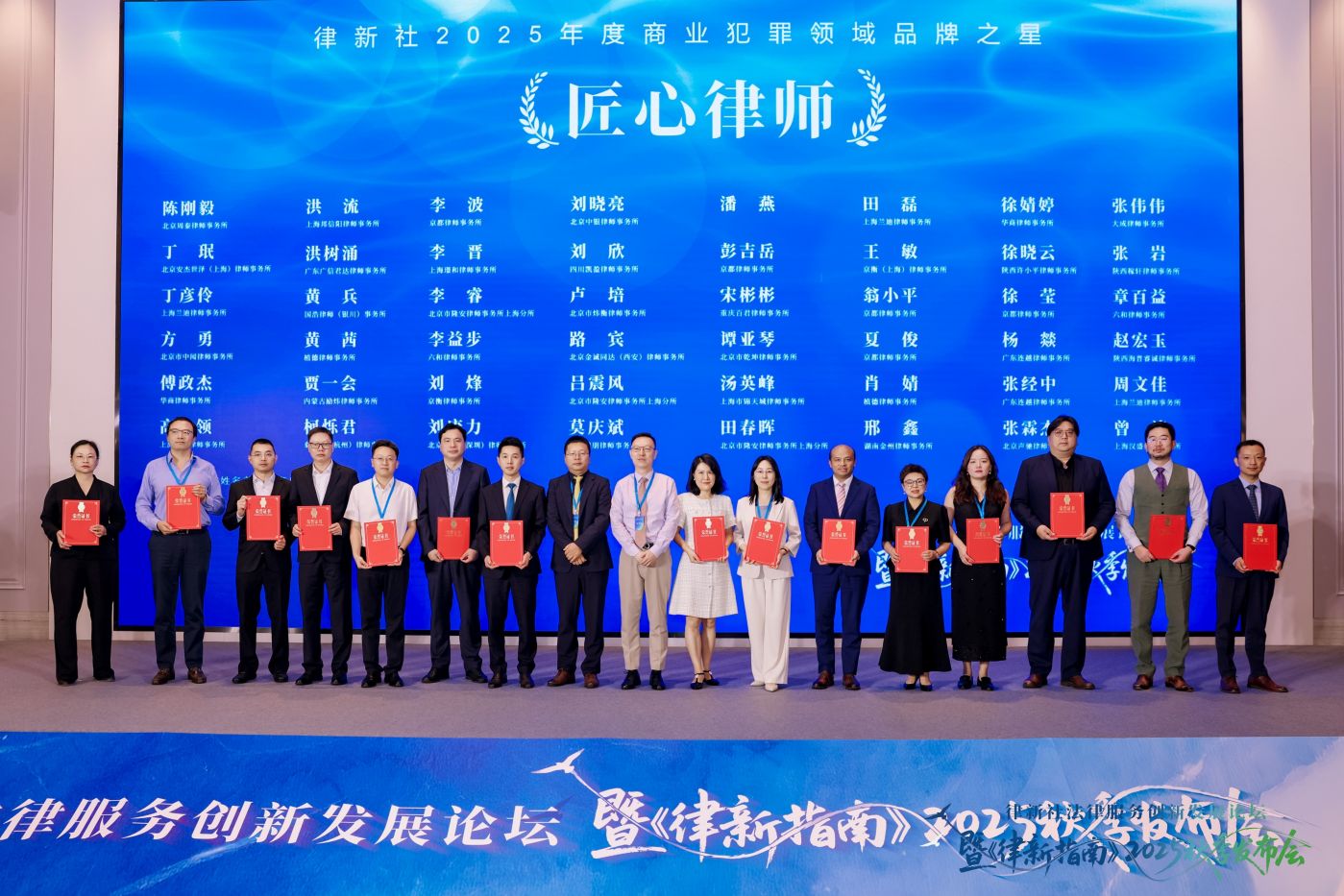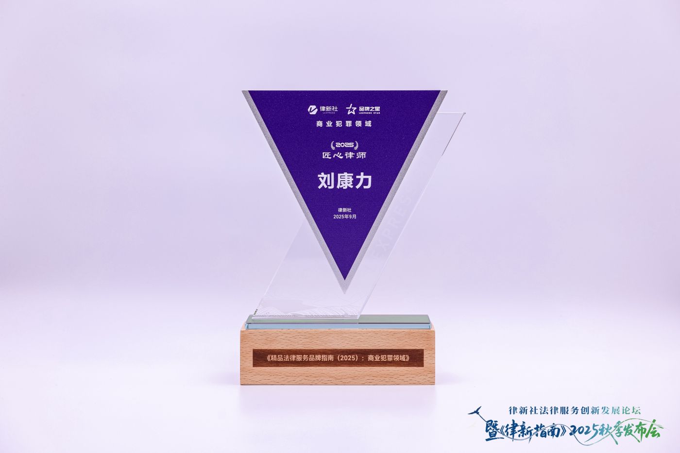 2025年9月7日,由律新社主辦的“律新社法律服務創新發展論壇暨《律新指南》2025秋季發布會”在深圳盛大啟幕,本所合伙人劉康力律師憑借在商業犯罪領域卓越的專業實力,榮獲“律新社2025年度商業犯罪領域品牌之星:匠心律師”獎項。