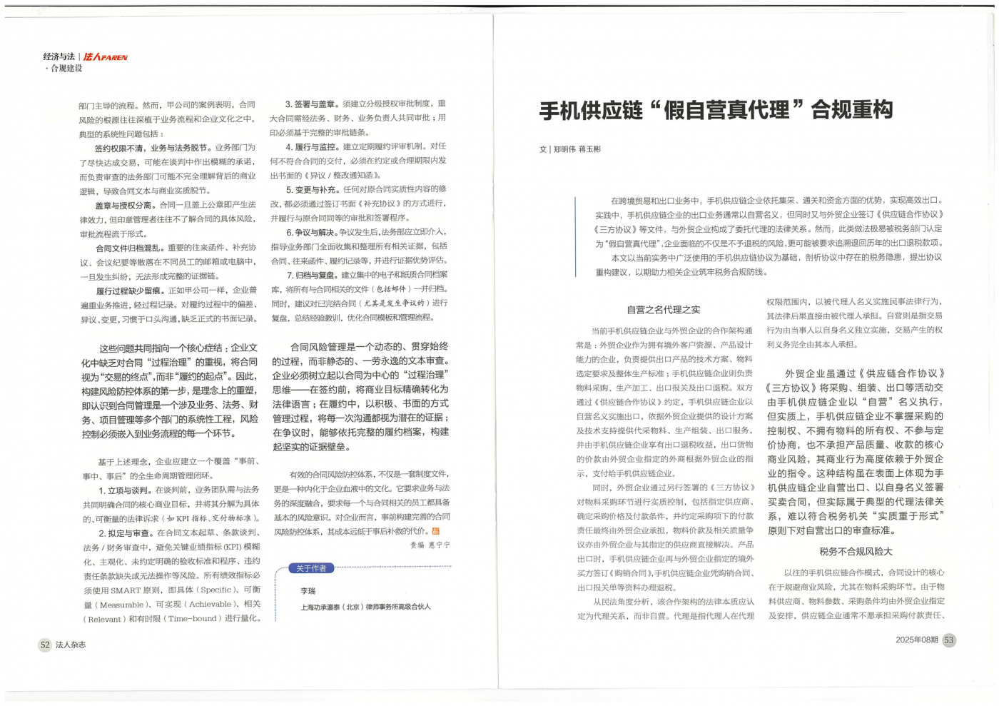 《手機供應鏈“假自營真代理”合規(guī)重構》一文于權威期刊《法人》正式發(fā)表,充分彰顯了其觀點的專業(yè)性與前瞻性。鄭明偉團隊長期深耕于手機上下游企業(yè)合規(guī)領域,深刻理解監(jiān)管邏輯,并積累了豐富的實務經(jīng)驗,善于為行業(yè)痛點提供切實可行的解決方案。因此,文中提出的合規(guī)重構路徑不僅停留在理論層面,更是立足實踐、可操作性強的專業(yè)指引,有效幫助企業(yè)規(guī)避重大稅務風險。