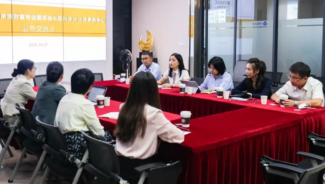 2020年10月27日,中銀律所婚姻家事及財富傳承專業委員會與盈科律所家族法律事務中心業務交流會在盈科所大會議室舉行。中銀律所婚姻家事及財富傳承專業委員會主任貢小娟律師、秘書潘航律師、委員王陽柯律師、武慧利律師、張涓律師,盈科律所家族法律事務中心主任杜芹律師、副主任劉亞娟律師、委員蘭娟律師、張彩容律師,出席了本次會議。